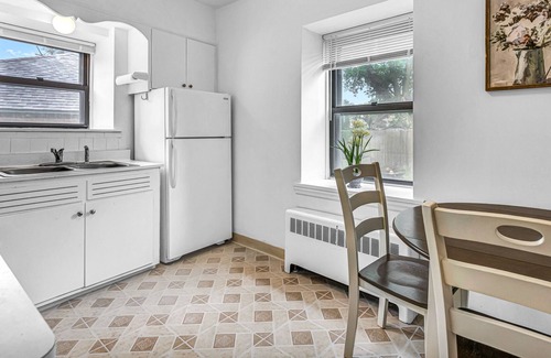 the fully equipped, early americana-style chef’s kitchen has original wood cabinets and woodworking, vintage formica countertops, large windows and retro-style linoleum tile floors The eat-in area has a small dinette with seating for three, beside a large window with views of the lush, historic neighborhood.