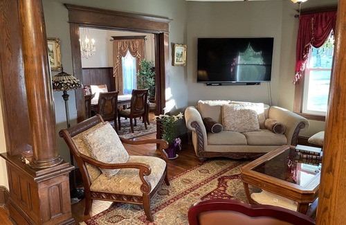 two stories of artisan woodwork cut with hydropower mills in the 1880's and finished by hand, crowned with a beautiful walnut staircase that's inviting and comfortable for any group A perfect space to entertain, relax and enjoy each other's company. The "Poff" home is a classic American Four Square built by W.J. "Jack" and Minnie Poff, owners of the local mill and distillery that provides ideal accommodations for multiple families, reunions, and large group gatherings.