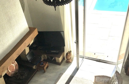 stay 35m2 with chimney (chimney not allowed), big corner sofa, television, opening on the north terrace, the west village, and the swimming pool in the south