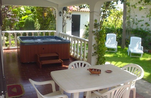 the villa is set within beautiful, mature, tropical gardens and is perfectly situated for the nearby beach, golfing facilities and is within easy walking distance to restaurants, bars and the train station The villa consists of a modern open-plan living and dining area, fully equipped kitchenette, 1 double bedroom, bathroom, large garden terrace and brand new Jacuzzi. To the side of the garden terrace, there is a private BBQ area to enjoy outdoor living with great views of the tropical gardens. There is plenty of parking space with a private driveway and carport. The gardens surrounding the villa are abundant with well established exotic plants and palm trees lending itself as a perfect setting for outside living, especially as this villa comes with its own private hot tub. WIFI is available if required, 30 Euros per week..