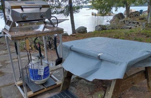 firepit skewer sticks, smores basket, logs and kindling, outdoor propane barbecue, barbecue tools, and patio furniture provided The firepit is close to the lake and the provided bucket to extinguish fires is easy to fill.