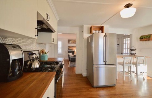 from the moment you walk through the door, you will instantly feel at home here The cottage is very clean and cozy, tastefully decorated with new furnishings and beachy decor. Natural light is abundant, and the space feels very light and pleasant. There is a washer and dryer on the first floor for your convenience, and all linens are included so you will have fresh sheets and towels when you arrive. Thebright and open kitchen has a farmhouse sink, butcher block countertops, new stainless steel appliances and is well-stocked with all the essentials. There is a breakfast bar that looks into the living room, and a dining nook with seating for 6.
