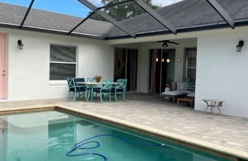 this stylish place to stay is perfect for vacation With 2 ensuite bedrooms plus 2 additional rooms and 2 additional semi private sleeping areas there is room for everyone. Every space is newly furnished with stylish pieces and comfortable beds. The pool area is fully screened in so you can enjoy the Florida weather without the bugs. The open concept space is perfect for large groups and families and the kitchen is ready for you to make a meal. A laundry room houses a washer and dryer.