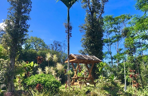 open floor plan, high ceilings and ceiling fans allow for optimal air flow Private! Filled with color, local art, and unique one-of-a-kind pieces. King bed, full bed, 2 twin beds, toddler bed, 3 Japanese style floor mattresses, and single person cot available for sleeping accommodations. Can hold up to 11 adults. Toys, high chair, bread maker, and pack and play available upon request. Large lanai, perfect for enjoying morning coffee, conversation, dinner, and games. surrounded by fruit trees and tropical jungle!