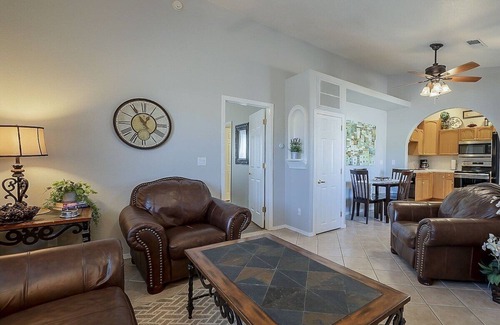 featuring high-end furnishings and tasteful decor, this charming mesa getaway is adjacent to a quiet neighborhood park, providing a serene atmosphere for relaxation The open living area boasts comfortable seating, a vaulted ceiling, a large TV, and inviting decor, perfect for a cozy movie night in.