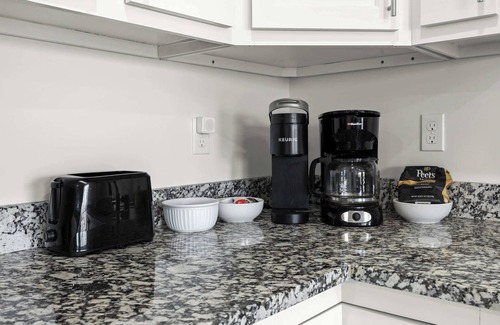 ▻ kitchen with stove, oven, fridge, microwave oven, basic cookware, drip coffee machine, keurig machine, dishwasher