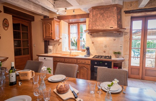 this stately country house in périgord noir is sure to please you, with its free location and views of the surrounding area The sand-coloured stones from days gone by create a typically French look, and with its dark beamed ceilings, the interior is also unique. Get cosy in the spacious living room or on the sun loungers by the shared pool. you may fish in the pond; ideal in preparation for an evening barbecue!