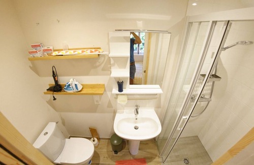 the kitchen is equipped with an oven, a stovetop, and a refrigerator, as well as a coffee maker, an electric kettle, and a microwave Bathroom amenities include a hair dryer, towels, and toilet paper. Other amenities include a BBQ grill, bed sheets, an ironing board, and heating.
