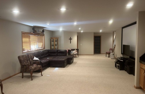 spacious living room, couch could be used for sleeping if needed, flat screen tv, wet bar, mini-fridge, air fryer, fireplace, access to beautiful yard, private entrance to basement, with parking area Wifi, apple, netflix, and Spectrum cable included.