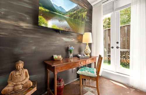 the garden guest house is thoughtfully appointed with modern conveniences, including a 60” tv and complimentary wifi, ensuring entertainment and connectivity throughout your stay Tall French doors beckon you to step outside onto the enclosed private patio, a verdant oasis offering a serene backdrop for relaxation. Take a seat at the charming little table with chairs, perfect for enjoying a morning coffee or a glass of wine under the open sky.