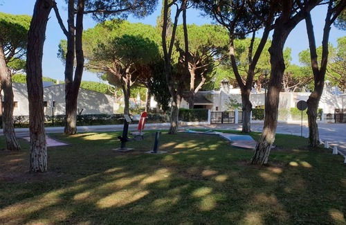 en una residencia turística con piscina en un entorno arbolado, jardín con juegos para niños y estacionamiento