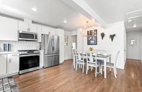 the main-level dining space is ideal for shared meals or board games Bright windows and retro charm make it a space you’ll want to linger in.