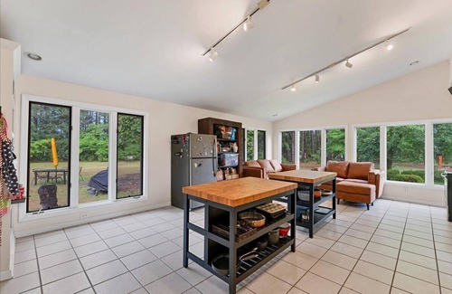 you will immediately be immersed in the quiet sanctuary of your own pine-lined private drive You’ve made it to your own 4 acre oak-shaded sanctuary and found this humble abode to be the perfect place for you and your family. All 4000 sq ft of The Ranch have been pain-stakingly restored and remodeled over the last 2 years so you are stepping into a brand new oasis! We have updated the floor plan to include 5 bedrooms, and 4 luxury bathrooms. The expansive living room opens up to the palatial dining room which is attached to the stocked and ready to go kitchen! There are a few bonus rooms which can also be used for sleeping when they aren’t being used for playtime, work, or studying. Several big screen smart TVs and sound systems have been installed throughout the house to accommodate your 21st century entertainment needs. There is a music nook available for use to any aspiring musical artists. And do not forget to whistle the evening away in the secluded yard laying about the hammock, picnicking in the shade of the magnolias, grilling on the lawn, or relaxing by the fire side. During the cooler months you are welcome to snuggle with a good book or a glass of wine and enjoy the warmth and ambiance of the wood burning stove. We are in the heart of horse and golf country with plenty of fun just a few miles away. This gorgeous home is centrally located just 3 Miles from downtown Southern Pines and 6 Miles from downtown Pinehurst. Within 10 minutes are numerous public parks, splash pads, miles of walking and biking trails, dozens of playgrounds, frisbee golf, tennis and basketball courts open and lit until midnight during the summer months. Your entire family will find something exciting for everyone of all ages. Be sure to stay Friday nights so you won’t miss free movie nights in the park, taco trucks at Southern Pines brewery, or live music at the downtown amphitheater. The home may be rented by the day, week or month fully furnished. All utilities are included in the pricing. You have the privacy and seclusion of your own driveway, front yard and space around your rental. We do allow pets, please discuss with Lauren before booking. we look forward to hosting you!