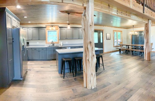this beautiful cabin sleeps 16 and has a large living area with fireplace and large kitchen It has 3 full bathrooms, 7 bedrooms, 5 with queen beds one king bed and 1 room with two sets of bunk beds. There are smart TVs in every bedroom and a large smart TV in the living room.