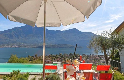 The Orchidea holiday home is the southernmost of three comfortable holiday homes in the mountain village of Vercana above Domaso, a picturesque village on the upper western shore of Lake Como, 3 km from the lake. A breathtaking panorama on a sun-drenched hillside, stretching south of the lake and contrasting with the majestic mountains of the surrounding area, makes this charming village with its Mediterranean climate a place that is suitable for a vacation in any season. Above is the Collina residence, and the garden, children's playground, and hobby room can be used jointly. On the lake side is the partially covered terrace with a large barbecue, dining table set, and deck chairs.