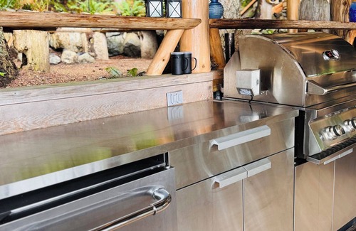 taking the stairs up the hillside you begin to see the beautiful log work that make up most of this stunning retreat At the top it opens up to a large outdoor covered living space, a lounge area with propane fire pit, dining area, and out door kitchen containing BBQ, mini fridge, sink, cook top, microwave, Insta pot, mini oven/air fryer and toaster. All open concept with the forest behind you and full frontal views of the ocean.
