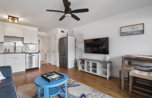 from the moment you enter fin's watch, natural light pours in through wide windows and a glass balcony door, welcoming you with an instant sense of ease The living area is thoughtfully furnished for relaxation, featuring a plush sofa and a large smart TV to keep you connected or entertained between beach days.