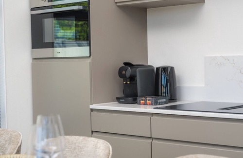 the cosy living room includes a seating area with tv, a dining table, and large windows that bring in plenty of natural light The modern open kitchen is fully equipped with an induction hob with integrated extractor, combi oven, and dishwasher – ideal for relaxed cooking together.