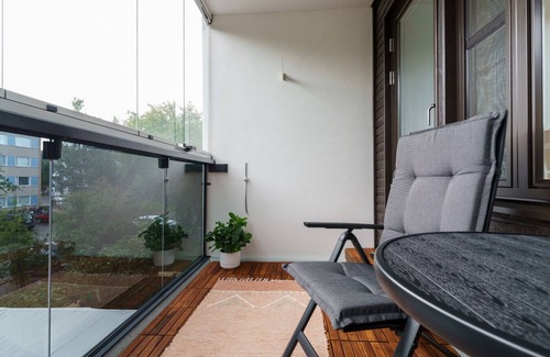 the apartment features a bedroom with two 90 cm single beds that can be combined into a king-size bed, along with a closet for storage In the living room, you'll find a 140 cm sofa bed, two comfortable chairs, a TV, and access to a private balcony overlooking the peaceful inner courtyard.
