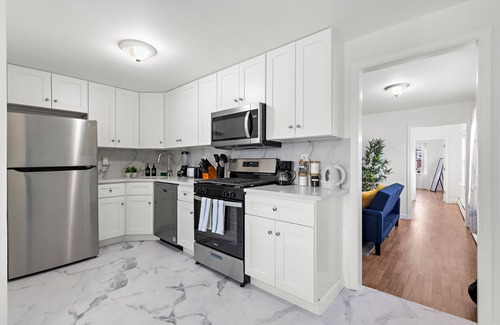 Discover NYC effortlessly! Minutes from Newark (NWK) & JFK airports, our location has a Light Rail station 5 min away. Enjoy a cozy stay with a memory foam queen bed, 2 twin beds, pull-out sofa, and roomy closets. Stay connected with fast Wi-Fi, a dedicated workspace, and two 4k UHD Roku Smart TVs. The bathroom provides complimentary toiletries, and the fully equipped kitchen ensures convenience. Benefit from private parking for a seamless experience..