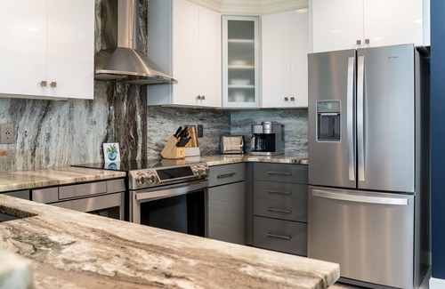 the second bedroom also has a king bed with updated full bath access Both bathrooms feature beautiful tiled showers and granite vanities. There is a new, full size LG washer and dryer for your convenience.