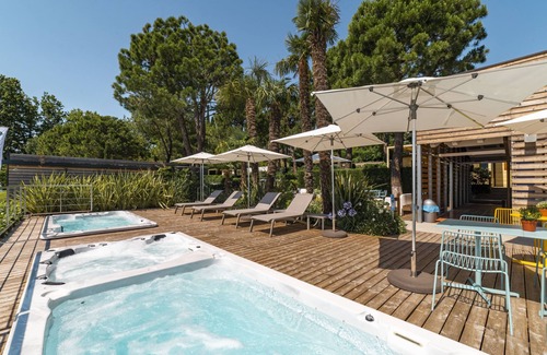 "lodge 7", 4-room mobile home 51 m2 Modern furnishings: living/dining room with dining nook and digital TV. Exit to the terrace. 1 room with 1 french bed (140 cm), shower/WC. 1 double bedroom with 1 french bed (140 cm). 1 room with 2 beds (70 cm), 1 x 1 bunk beds (70 cm, length 170 cm). Kitchenette (4 induction hot plates). Shower/WC. Air-conditioning, forced-air heating. Terrace roofed. Terrace furniture. Facilities: baby cot (extra). Parking (1 car). Please note: non-smokers only. Please note: The residential unit consists of 3 separate residential modules with a small plot of land between the modules. Module 1: Living/dining room with kitchenette and covered terrace. Module 2: Double room with shower/WC. Module 3: Double room. Bedroom with 3 beds. Shower/WC accessible from both rooms. Bed layout is flexible. There are more sleeping options available than the maximum number of people allowed which may, however, not be exceeded. it017171b1zjwa3yle