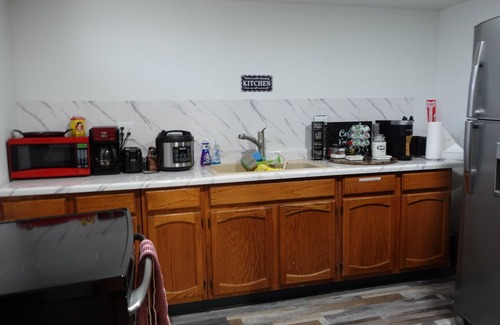one bedroom 1 queen bed, phone chargers,55 tv, one kitchen with microwave and kitchen utensils, refrigerator and coffee maker one restroom and living room with fold out couch bed, board games like chess, UNO play cards and dominos.