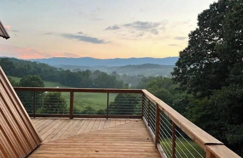 unique a-frame built on a bluff over-looking rolling hills and the blue ridge mountains 3 bedrooms and a loft allow for 8 guests to have a dedicated bed. But you can add 2 more if you use the air mattress. A luxury level hot tub, fire pit, corn hole and basketball arcade allow for relaxation and fun. Sit on one of the three decks and take in the sounds of nature. Watch the deer and turkey roam the fields through the binoculars. Listen to the sounds of the Smith River from the front deck.