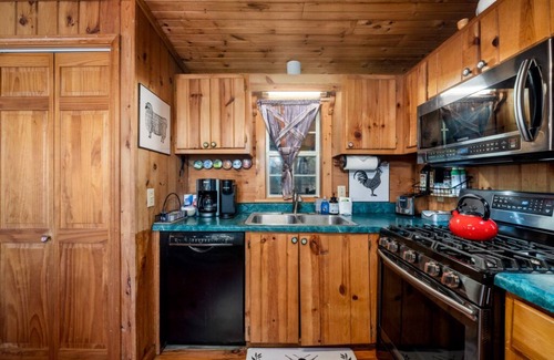 this quaint cabin includes two cozy bedrooms, providing space for a peaceful night's rest Additionally, the guest house features a queen sleeper sofa, ensuring comfortable accommodation for all. The interior has cute furnishings and charming decor, creating an inviting atmosphere that exudes warmth and hospitality. Copper Kettle Cabin is perfect for pet lovers, welcoming furry friends to share in the experience.