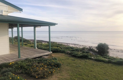 a character filled light and airy original shack located right on the beach at hardwicke bay with expansive views across turquoise water and pristine beaches Uniquely placed to enjoy the coastal environment and dynamic bird life right in front of your door – there is no road between you and this breath taking vista. The samphire covered rocky point and endless beaches provide hours of entertainment for nature lovers & intrepid explorers.