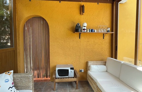 master bedroom with double bed, built-in wardrobe, air conditioning and access door to the terrace Open terrace with awning, sea view and cosy lounge. There are three extendable clotheslines to dry your laundry.