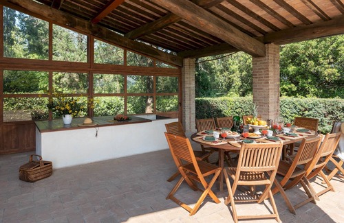 the area around the villa covers 1200 hectares of land covered with woods where you can enjoy long relaxing walks in peace and tranquillity Adjacent to the villa is a beautiful well-kept park of 500 sq m. A row of cypresses borders the dirt drive that leads to the partially covered parking area and then continues up to the entrance to the villa, also easily reached from the parking area via a flight of stone steps. The garden is covered by natural grass and enriched by dense bushes and trees such as holm oaks, oaks, olives and myrtle providing many shady areas, especially in the part behind the villa, set up with comfortable wooden benches where guests can enjoy the fresh air and just relax. Furthermore, throughout the garden are herbs such as rosemary and sage, the typical flavours of Tuscany that you can use to make your dishes tastier. On the covered, tiled patio is the outdoor dining area, connected to the dining room inside the villa.
