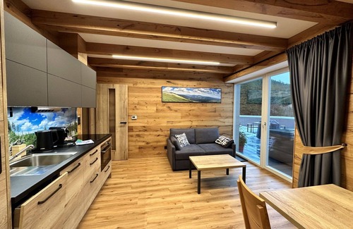 the rezidence krakonoš 101 offers a 3-room apartment on the ground floor, ensuring convenient access during your vacation The spacious and luxuriously furnished living area features a dining table and television, providing a comfortable space to unwind. Additionally, there is an exit leading to a terrace from the living room.
