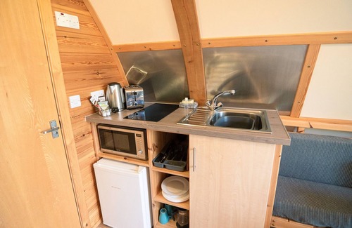 kitchenette with sink, 2-ring hob, microwave, kettle, toaster, and fridge with ice box