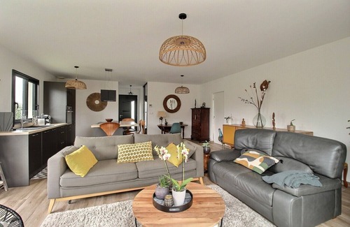 the house, recent (built in 2021) welcomes you in a living space of about 35m2, composed of a kitchen equipped with oven, induction hob and dishwasher