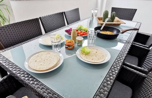 the entire apartment has high-quality tiled flooring and is heated via modern underfloor heating – ensuring a pleasant indoor climate all year round The large, fully covered balcony invites you to enjoy meals outdoors – even with eight people, there’s plenty of space to dine together, relax, or simply take in the view.