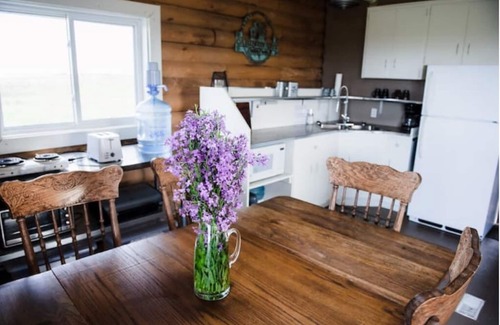the cabin on the coulee is a lovely two story rustic log cabin on a complete section of land (640 acres - 250 ha) that overlooks a 200 acre alberta coulee, making for an amazing view! it rents as a complete unit that sleeps up to 6 adults with a full bath on the main floor and a half bath upstairs The cabin has a refrigerator, range, a full kitchen (including dishes, cutlery and cookware), a propane gas BBQ, a wood stove, an outdoor fire pit, high speed WiFi and a projector for movies.