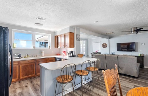 inside the home you will find a well stocked kitchen, comfortable living room with flat screen tv and pac man arcade game, as well as two bedrooms and a full bath The first bedroom includes a King bed while the other bedroom has a queen bed. Both bedrooms feature comfortable bedding and large windows with lake views. The shared bathroom features a tub/shower combo.