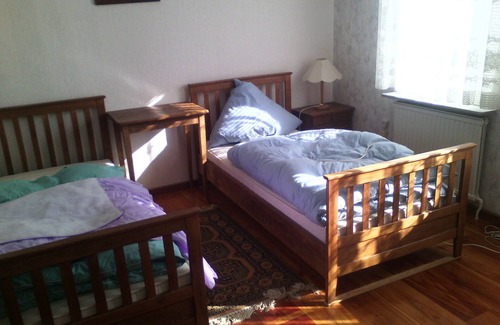 the living area is approximately 110 m² and can accommodate up to 7 adults and 1 toddler Staircase, The rooms are distributed on two floors. Since the house in the back has a slight hillside, the "upper area" is actually the ground floor. In the upper area there are living and dining room, the kitchen with dining area, two bedrooms and the bathroom. The kitchen is very well equipped and has a dishwasher and a 4-ring ceramic hob with oven. Next to the kitchen is a bedroom with two single beds. The large and open living and dining area is furnished with a TV (German channels) and a dining table. The fully glazed conservatory is accessible via the living area. The second bedroom has a double bed. The first of the two bathrooms has a bath and a toilet. About the stairs in the entrance area it goes to the "lower floor". On the right side is another bedroom with a single bed that can be separated by a curtain. The 4th bedroom is in the room next to the open bedroom and has a double bed. The second bathroom is opposite the open bedroom and has a shower and a washing machine.