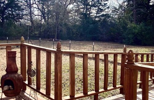 there is a pond on the back part of the property If you want to give fishing a try we ask that you catch and release at this time. It’s not a swimming pond. If you wade in or decide to cool off in the water then that is at your own risk. The property has a nice mixture of woods and pasture areas and you’re free to roam and explore, but please remember that it is the country and there is always a chance that you meet up with some of the wild life especially at night. This is a NO Hunting/Shooting property. Due to the fact that our property is so small we also do not allow ATVs, go Karts, dirt bikes, mini bikes etc. Please do not go beyond any of the barbed wire fences that are in place since that is other ranchers property in the area.
