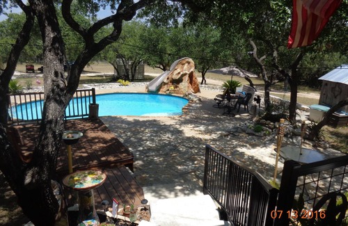country setting with quietness and tranquility just minutes away from the many activities available in new braunfels, gruene, canyon lake, whitewater amphitheatre or other surrounding areas!! walk up a flight of stairs (17 steps) thru your private entrance into a spacious, 750 sq ft, suite-like apartment where your family can relax in the comfort of your home-away or on your private covered balcony before enjoying the numerous various attractions nearby The rental is attached to the main quarters of the house (2nd floor over carport/garage area) and the owners live on-site, however, it is very private and unassociated with the owners' homestead. The rental is conveniently located only minutes away from Schlitterbahn, Guadalupe/Comal Rivers, Gruene, Canyon Lake, Whitewater Amphitheater, Stars and Stripes Drive-In Theatre, Landa Park or Fischer Park, and all the other attractions in and around the New Braunfels area. The rental is decorated with a personal touch to brighten your stay and give you the "homely feeling". There are hardwood floors throughout bedroom, living room and kitchen area. The bedroom/living room are combined with 1 queen bed, 2 twin beds, Loveseat and 2 lounge chairs, ceiling fan, 32" TV, DVD, VCR, fiber optic cable, Wifi, internet. The kitchen is equipped with a full size refrigerator with icemaker, 2-burner electric cooktop and convection microwave and convection toaster oven. Dishes, glasses, silverware, pots, pans as well as coffee makers (Keurig and 10-cup drip), blender and toaster, and some paper amenities are provided. The tile floor bathroom is spacious with a walk-in shower and ceiling fan. Bathroom/kitchen towels and bedding are provided (pool towels not provided), but will not be exchanged during your stay. A large propane/charcoal grill is provided for your outdoor cooking with a playground close by. After a long day of sightseeing, shopping or playing, grab your favorite beverage and relax on your private balcony, multiple porches/decks or poolside and enjoy the scenery of wildlife and birds roaming the 3-acres. Locusts and Katydids will serenade you in the evening. We are in the country, so you may encounter other bugs/insects, etc that call this "home", therefore, if you are afraid of a "fly", this place may not be suitable for you. Enjoy swimming in your private pool (not heated for cooler months) before your adventurous day or after coming back and winding down. On those cozy evenings, sit around the fire pit (bring your own wood) talking about good ole times and roasting marshmallows. There is plenty of secure parking for all your water toys. This is a private rental, therefore, only you and your paid guests are allowed to be on the premises and use the facilities. Forgot something, don't worry, owner on-site and can help you out..