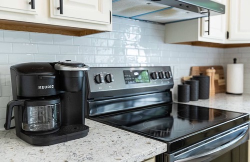 *full stocked kitchen (pots, pans, cutlery, dishware, air fryer, juicer, blender, coffee maker, microwave, oil, flour, milk, etc)