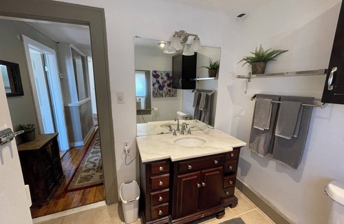 A beautiful upstairs apartment in the heart of central Austin. This location is very walkable and an easy drive to many cool spots, located just 1 block from Loop 1.There is easy parking behind the house as well as on the street. The house and deck are oak tree shaded and the house is full of windows. There is a modern kitchen, updated bathroom and original hardwood floors throughout, laundry room with washer and dryer, dining room, breakfast area and an office nook with a desk..