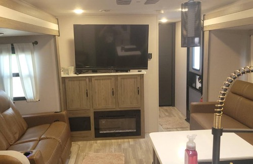 this phenomenal property features 2 cozy bedrooms with a mix of queen, twin, and full beds, perfect for a group of friends or family With amenities like heating, AC, fireplace and WiFi, guests can stay comfortable and connected. The bathroom offers a convenient shower for refreshing after a day of exploring. There is an outside screened in room with large TV, table, chairs, fans. Book now and enjoy everything this marvelous recreational vehicle has to offer..