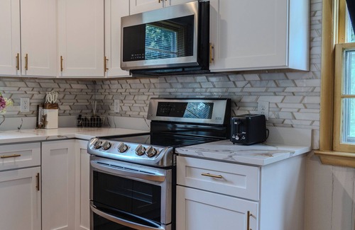 2 kitchens Cook like a pro in the modern kitchens with essential appliances and tools, including an electric in-counter cooktop, stove and oven, microwave, refrigerator, coffee maker, blender, and more.