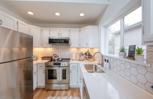 simple yet high-end, woodsy yet beachy, snug yet airy—this dual personality, newly remodeled “a-frame” retreat has an inviting, open concept living space with plenty of windows to let in the natural light The full kitchen is thoughtfully stocked with dishes, cookware, herbs and spices, a blender, and coffee supplies: a Keurig, French press, and grinder.