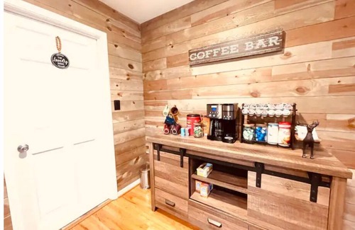 fully stocked eat in kitchen, dining room and a coffee bar with keurig coffee, regular coffee pot for brewing a large pot of coffee and a good selection of coffee