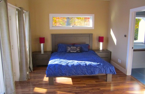 the hemlock house offers all the amenities one can desire Polished concrete floors, white walls and beamed ceilings create an airy, open space for the House’s modern furnishings and artwork. The first floor features a modern and fully equipped kitchen that will accommodate both cooking enthusiasts and professional chefs alike. The dining room table easily seats six and there are three additional seats at the adjacent breakfast bar. The floor to ceiling window walls in the living room are the main attraction supported by colorful and comfy modern furniture.