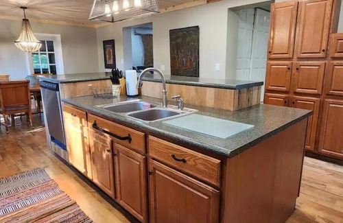 ruby gem cabin offers 4 bedrooms with 5 beds, a queen blow up and room on the large living room sofa to accommodate up to 11 people The kitchen and dining room are large with plenty of chairs. 2 newly remodeled bathrooms with special design touches, plus an additional outdoor shower for the warmer months.