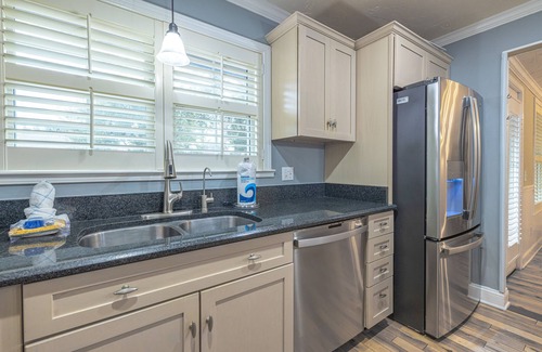 this cozy home offers everything you'll need for an isle of palms getaway Walk up the front steps and enter to a an open concept living and dining area. With the fully equipped kitchen to the right, you're able to whip up a family breakfast or quick beach lunch before heading out for the day. This home comes with a washer and dryer off the kitchen area. The dining table seats 6, plenty of space to enjoy a meal together! The living room has a comfy couch and two chairs around a flatscreen TV so you can keep up with all of your favorite shows. Out through the back door, enter the large screened in porch. With a table and couches there is an abundance of space to enjoy the outdoors together! There is a gas grill on the non-screened section of the porch.